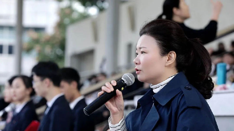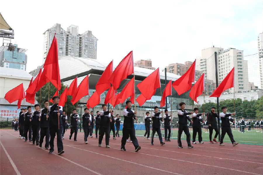 运动场上队伍整齐排列完毕,李小华校长开始致辞。他感谢为筹备本次运动会付出了辛劳的体育组全体教师、德育处老师以及其他相关工作人员,感谢到场赞助的兄弟单位的专家裁判,预祝运动会圆满成功。升旗仪式后,汪志颖书记宣布运动会开始。