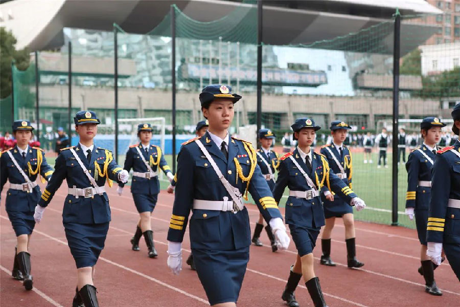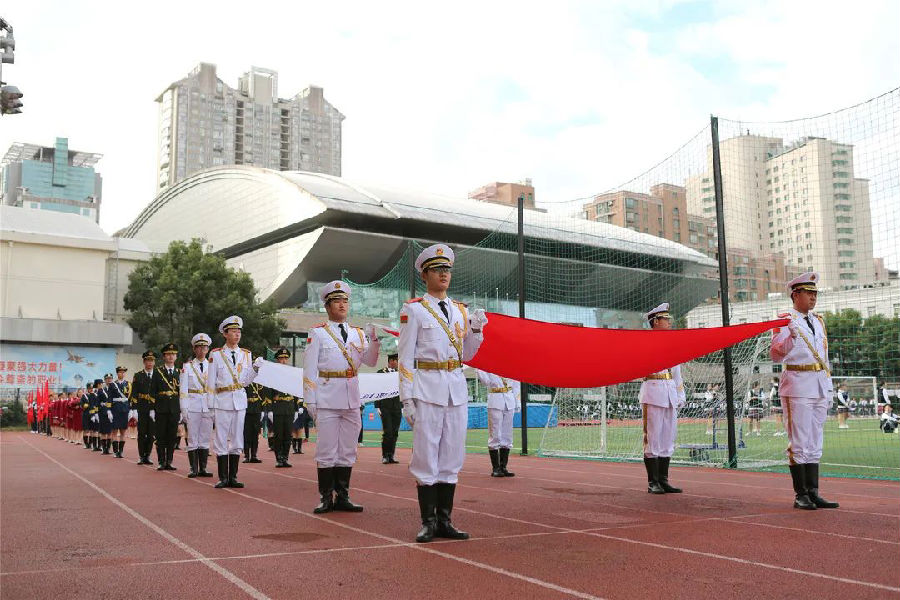 国旗队的进场拉开了运动会的序幕。国旗护卫队于2016年成立,今年第一次在运动会上以方阵的形式展示,队员们身着海陆空军服,精神饱满,气宇轩昂,迈着整齐划一的步伐,在这个注定不平凡的年度里,用自己独特的方式表达着对祖国的敬意。随后走上赛道的是我校传统项目—鲜花队和红旗队。