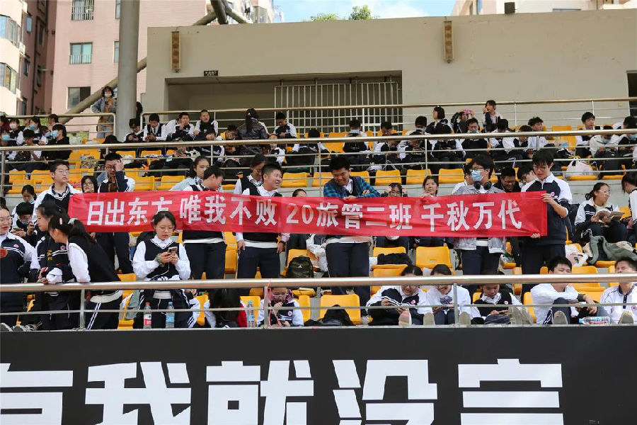 紧接着进场的是入选广播操决赛的20个班级。各个班级走到在主席台前都稍作停留,表演精心准备的小节目。有的班级用嘹亮的口号展示班级精神风貌,有的班级用彩带拼出图案渲染艺术气息,有的班级自制道具诠释专业特色……有的班级把网红音乐带到运动场,随着《酒醉的蝴蝶》,同学们伸展摇曳,就像只只自由飞翔的优美蝴蝶。