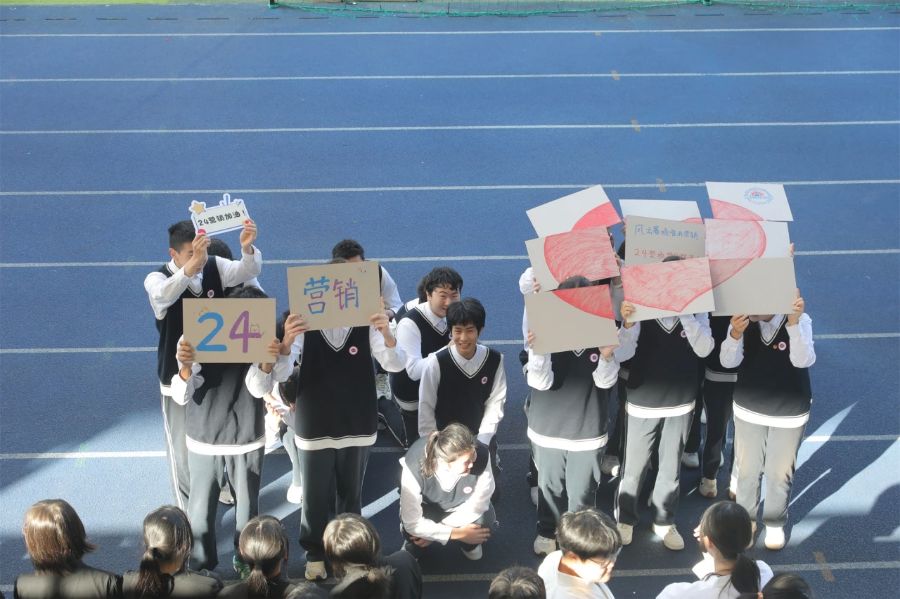 运动会的蓝色跑道上,24营销班的学子们正用创意与热情点燃赛场。他们手持写有“24”“营销”的标牌,还有拼接成爱心的画板,上面“风云赛场谁与争锋,24营销勇创辉煌”的字样格外醒目。一个个青春的身影在阳光下集结,或举牌呐喊,或并肩微笑,将班级的凝聚力与对赛事的热忱尽情展现。每一张标牌都是他们的战旗,每一抹笑容都是他们的宣言,在这片运动场上,24营销班以独特的方式诠释着青春的活力与团队的力量,为运动会奏响了一曲热血激昂的班级乐章。