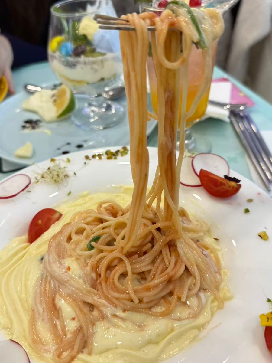 银叉轻挑,裹满奶橘酱汁的意面如琥珀色绸缎垂落,每根面条都裹着柔润的奶油光泽,沾着细碎的青蔬碎,顺着叉尖微微晃荡,像刚从糖罐里捞出来的甜软丝线。盘底铺着一层绵密的奶黄色基底,边缘错落着嫩红的小番茄片、薄透的水萝卜圈,星星点点的开心果碎与芽苗舒展着,像给这碗意面缀了层清新的蕾丝边。