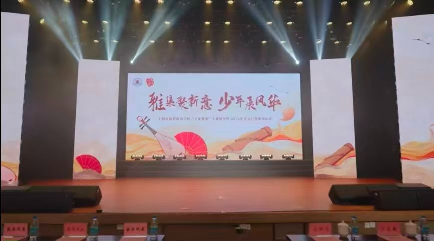 舞台上的灯光束划破夜色,大屏上“雅集聚新意 少年展风华”的主题字格外醒目,国风的琵琶、折扇图案将中式美学拉满,一场热闹的迎新活动就此拉开帷幕。