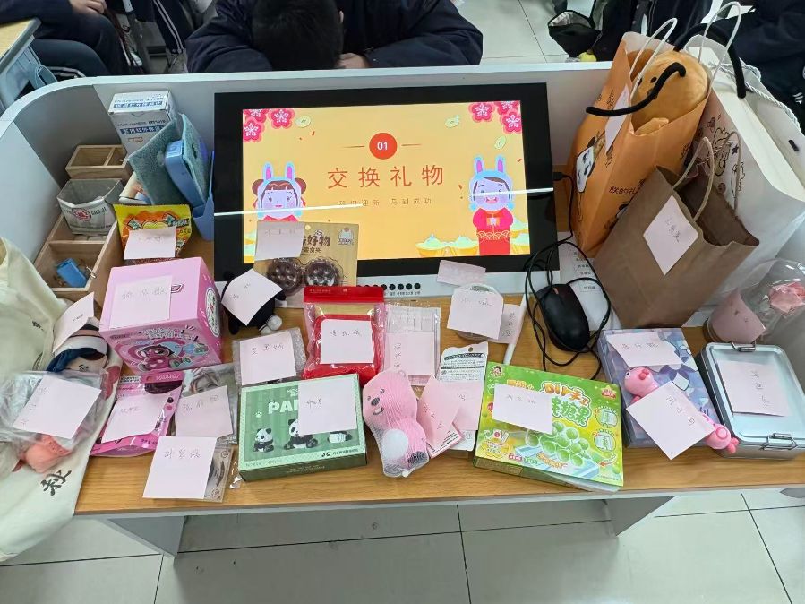 教室里的课桌被各式礼物摆得满满当当,电子屏上“交换礼物”的字样搭配着萌趣的小马图案,年味与童趣交织。同学们精心准备的礼物裹着彩纸、系着便签,从可爱的玩偶到实用的文具,从香甜的零食到精致的手作,每一份都藏着心意。