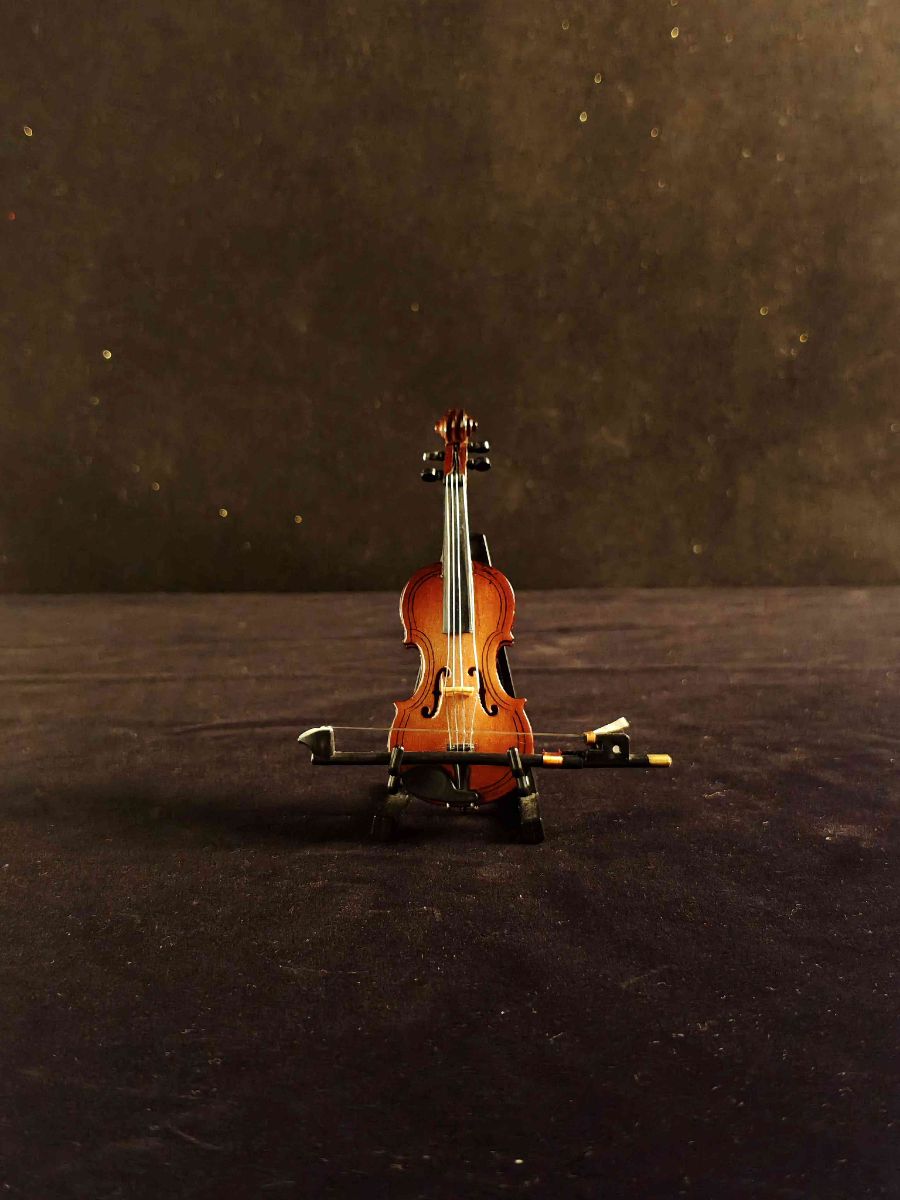 镜头对准这把迷你小提琴时,仿佛握住了一整个音乐世界的缩影。棕红木纹在暖光下泛着温润光泽,琴身的弧度、琴弦的张力,连琴弓的细节都复刻得栩栩如生,让方寸之间满是精致。