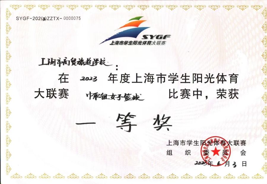 最终我校女子篮球队荣获2023年上海市学生阳光体育大联赛(中职组女子篮球)比赛一等奖、21商英班鞠亚希同学荣获最佳运动员奖项。