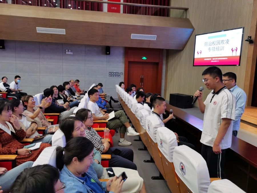 任教授及时调整培训策略,随机询问在座同学是否经历过、听说过或看到过校园欺凌事件。同学们积极参与互动,讲述自己身边或者通过网络平台看到的相关校园欺凌事件。