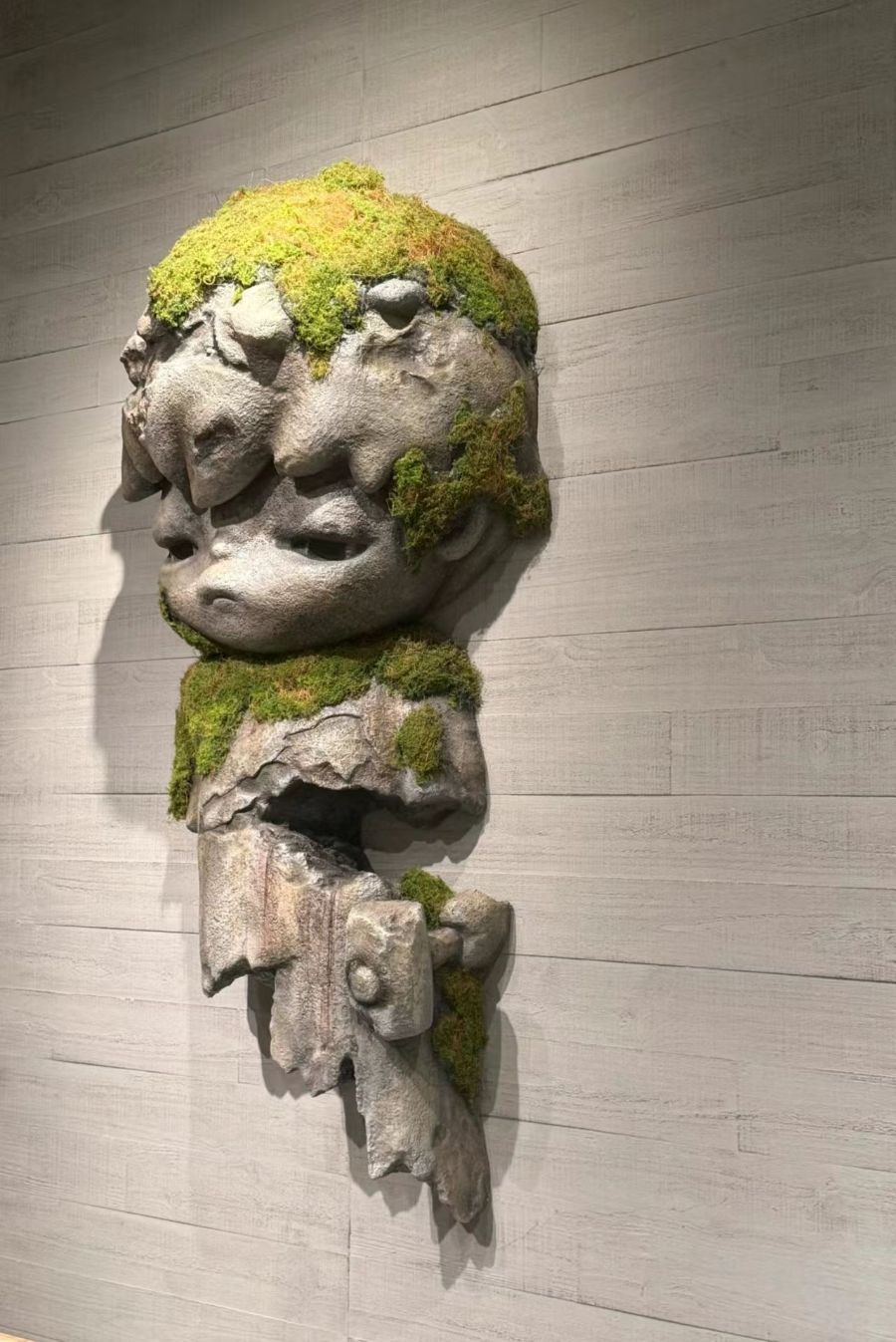 这是一幅充满自然与艺术交融的雕塑作品。雕塑的主体是一块石头,雕刻出类似人头的轮廓,面部表情柔和,五官轮廓清晰却又带有一丝粗糙的质感,仿佛是岁月风蚀的痕迹。雕塑的头部、颈部和衣领部分被翠绿的苔藓覆盖,苔藓的生长自然而随意,为冰冷的石雕增添了一抹生机与灵动。