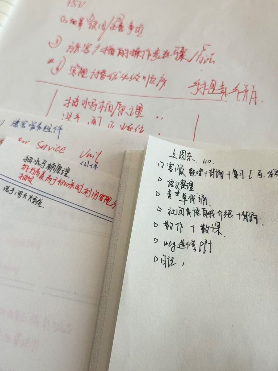 临近期末,我为航空服务专业的复习制定了清晰计划。先梳理客舱服务、广播操作、抽水马桶原理等专业知识点,结合课堂笔记拆解实操步骤,比如客舱广播的流程和应急设备的使用顺序,反复背诵并模拟操作。文化课方面,我整理语文知识点、背诵英语专业词汇,还针对社团英语自我介绍这类实用内容专项练习。每天划分时段,兼顾专业课实操与文化课背诵,遇到难点及时标记并请教老师。复习不仅是巩固知识,更是让我熟悉航空服务的职业规范,我会带着这份严谨,把复习成果转化为专业能力的提升。