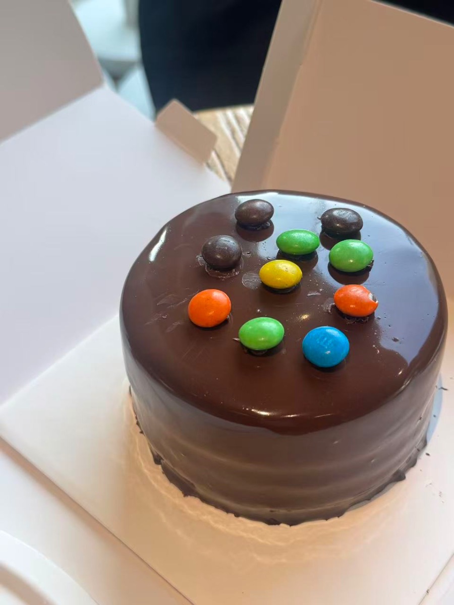 打开白色蛋糕盒,一枚巧克力淋面蛋糕瞬间抓住视线。深棕色的巧克力镜面淋面光滑锃亮,像凝住的浓醇巧克力酱,泛着诱人的光泽。彩色的糖豆错落点缀在蛋糕表面,红、绿、黄、蓝的圆润糖豆,搭配几颗深棕巧克力豆,在深色淋面的衬托下,像撒落的彩虹碎钻,活泼又俏皮。