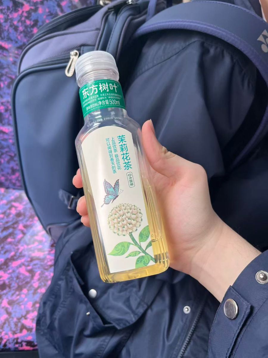 这张图片展示了一只手握着一瓶东方树叶茉莉花茶,画面清新自然。瓶身是透明的塑料材质,里面装着淡黄色的茶汤,容量为500ml。瓶身标签设计简约雅致,白色底色上印有淡绿色的茉莉花图案和一只蓝色蝴蝶,搭配“茉莉花茶”的文字,充满春日气息。瓶盖处的绿色标签清晰标注着“东方树叶”品牌名。背景是深蓝色的衣物与紫粉色纹理布料,色调对比柔和。整体画面干净明亮,手部姿态自然,凸显出饮品的清爽质感,传递出一种简约、健康、清新的生活氛围,让人感受到茶饮带来的舒适与惬意。
