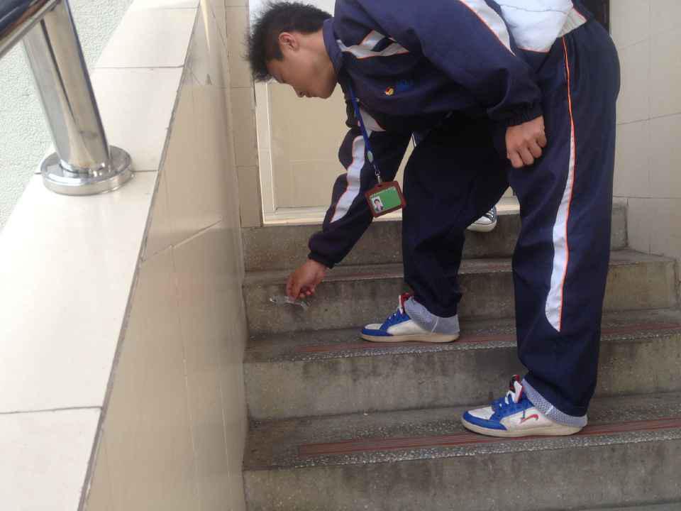 同学看见楼道里有垃圾,举手之劳,将其捡起扔进了垃圾桶,爱护环境人人有责。